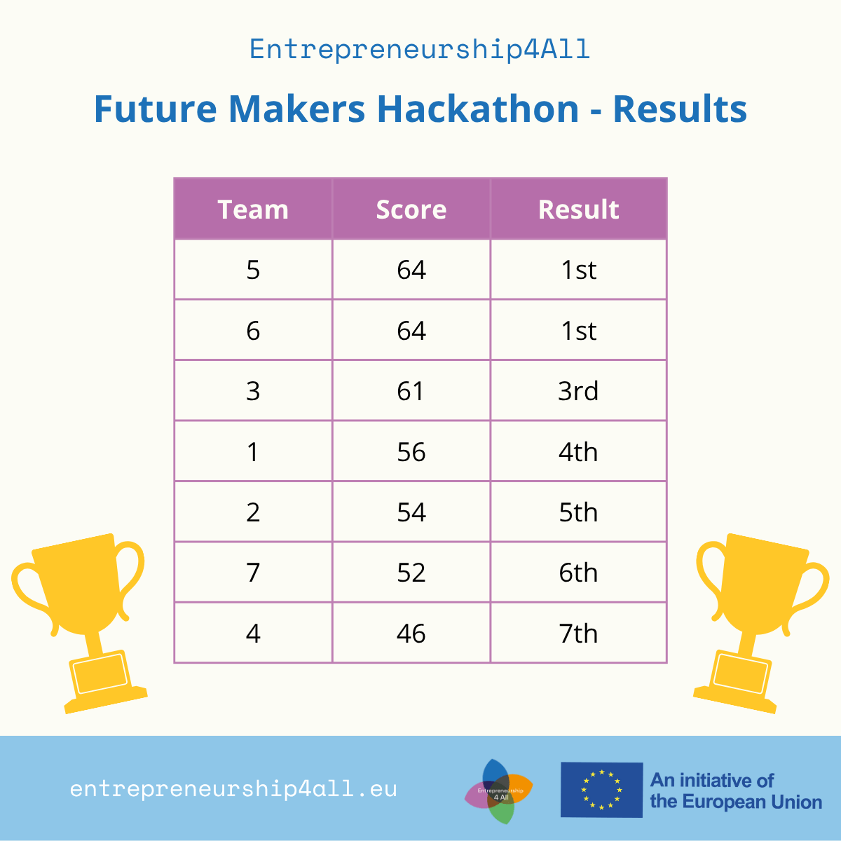 The Entrepreneurship4All Future Makers Hackathon is a high-energy, half-day online event where creativity meets real-world impact. We’re bringing together innovators, dreamers, and problem-solvers from across Europe and beyond to tackle short, real-life challenges faced by entrepreneurs today. In just a few hours, you’ll collaborate in diverse teams, design bold solutions, and pitch your ideas to expert judges – all for a chance to win exclusive group coaching sessions with top industry mentors.